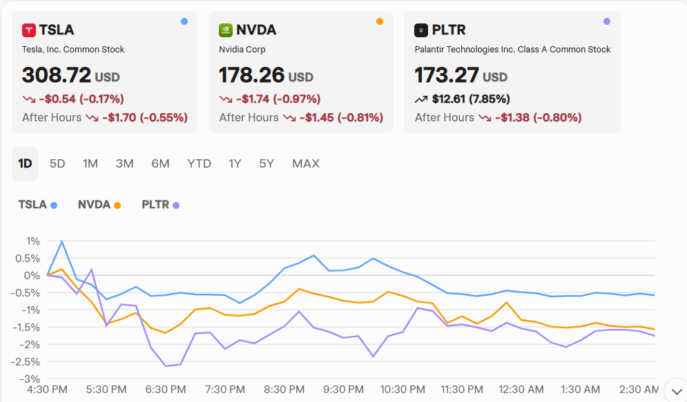 - PLTR appears at $173.27, with very positive sentiment after strong earnings and new partnerships.