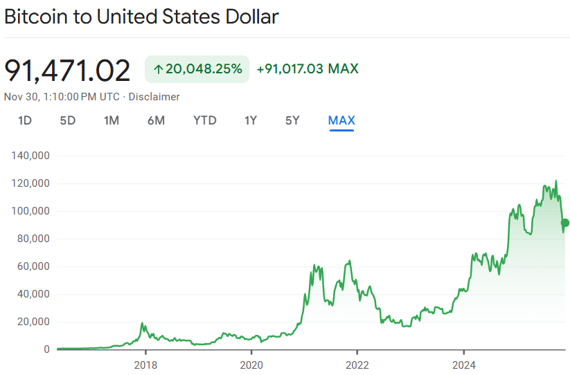 Bitcoin holds steady around $91,000 after a brutal November drop from its $126,000 October peak, marking the crypto’s second-worst month of 2025 with over 17% losses. As of November 30, BTC/USD trades at about $90,841, up slightly amid Fed rate-cut optimism and ETF inflows. Bitwise’s André Dragosch calls this a prime “asymmetric risk-reward” setup, with recession fears already baked in.