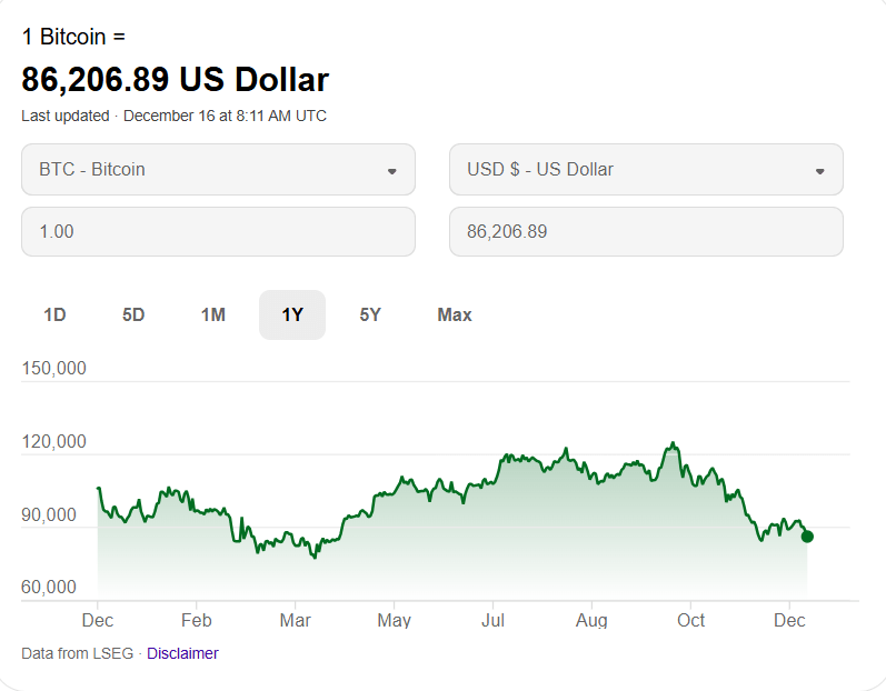 Bitcoin has extended its downward slide, hovering near $86,000–$86,500 as of December 16, 2025. This marks a roughly 30% drop from its October record high, fueled by thin holiday liquidity, significant ETF outflows, and over $500 million in long liquidations during the latest plunge. Bloomberg and Reuters highlight how low trading volumes have amplified the volatility, decoupling crypto from the modest rebound in stocks and other risk assets.